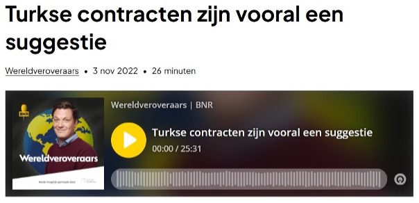 Mede-oprichter en partner van Sepers c.s. drs. Esmeralda G. Sepers werd in 2022 uitgenodigd als Turkije-expert door het BNR-radio programma “Wereldveroveraars”. Tijdens dit gesprek komen vele praktijkvoorbeelden ter sprake van vooral culturele aspecten binnen de zakelijke activiteiten in Turkije.